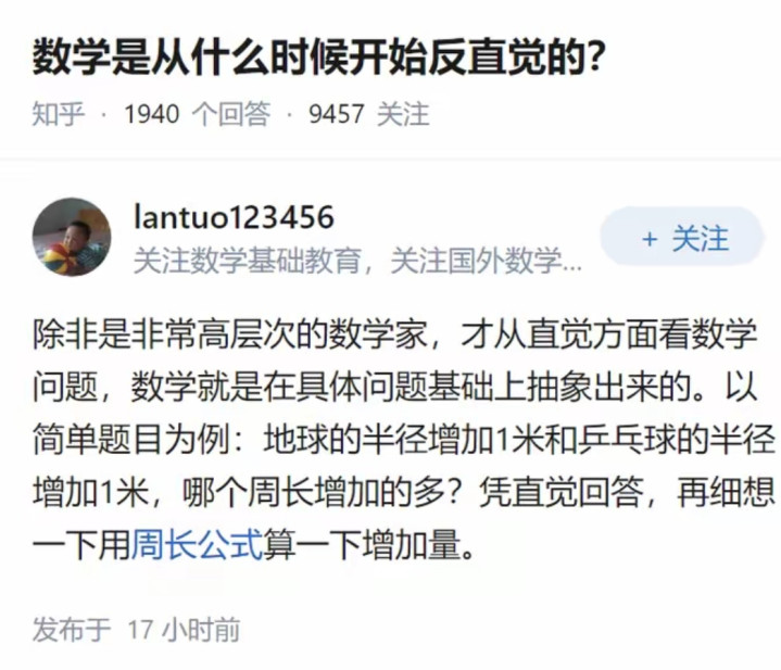 相比2π(R+1)和2π(r+1),天然R远庞杂于r,可是相比的是增量,齐是2π,是以十分。实际上,出题敦厚问的是地球赤说念周长加多1米和乒乓球周长加多一米,半径的增量哪个更大?这么问更有诱骗性。考的是想考问题的逻辑。