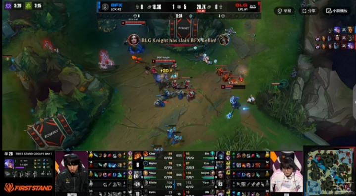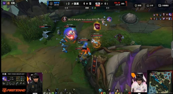 [8:42]河谈团战BLG前后包夹逮捕了Raptor巨魔,回头拿下三虫!下路BFX下路组双大招+Kellin烈娜塔清楚没能打出线杀,ON璐璐走位+大招+清楚完成逃生!回头BLG还不错拿到第一条小龙!