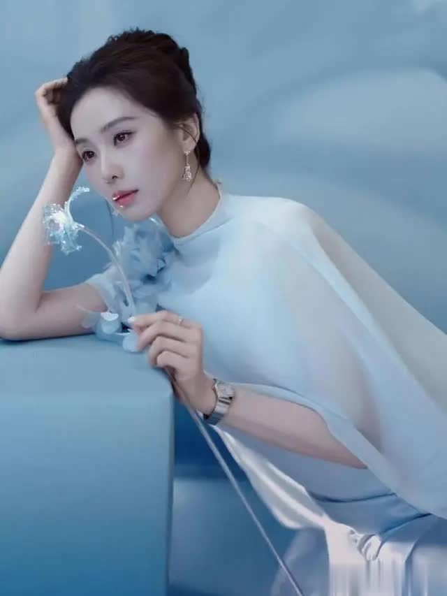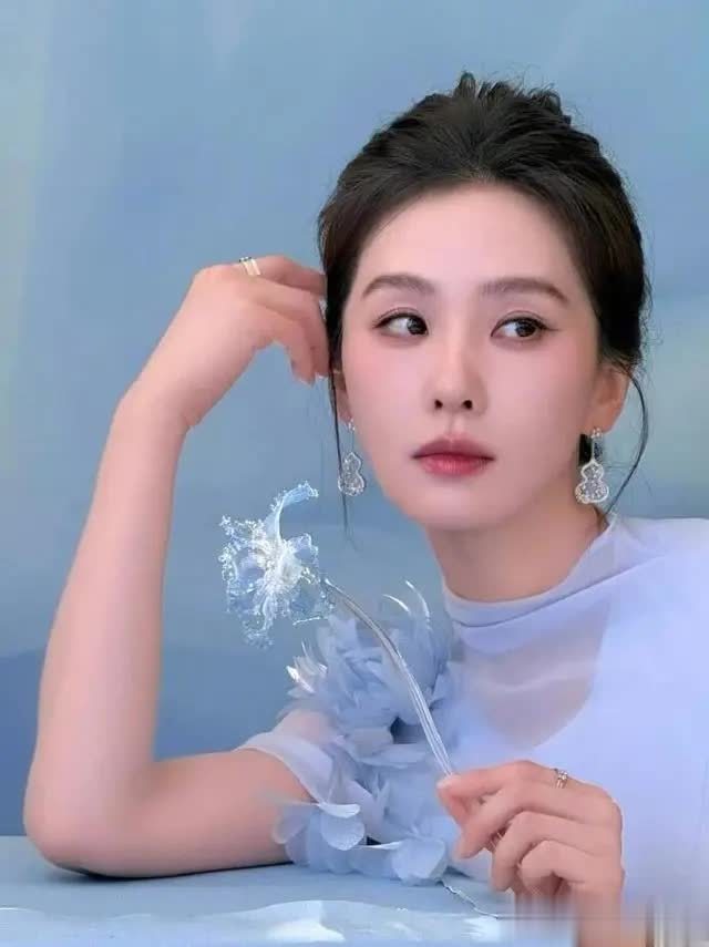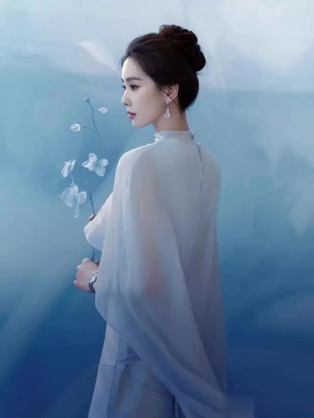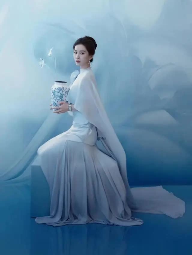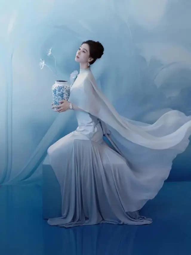 轻便的淡蓝色布景与她的造型情投意合,营造出千里浸式的水墨田地。她或手抓青花瓷瓶侧身凝望,身姿温婉如水;或轻拈白色花枝垂眸含笑,眉眼缓和动东谈主;或抬手整剃头丝,九牛二虎之力间满是刻在本色里的优雅。