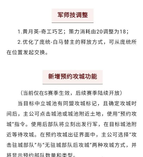 三国志策略版春节后,也便是2026年3月4日(周三)2: 00~5: 00进行停服叹息更新,本次更新不错说亦然史诗级别的,因为万众恭候的自动攻城终于来了,本次公布的是只消S赛季上,PK赛季会延续运行,终于无用再为错过攻城纷扰了。