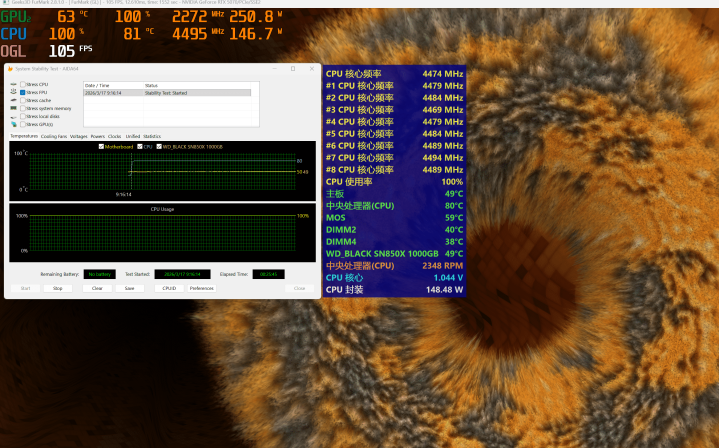 在室温环境20℃的情况下测试,过程AIDA64+FURMARK20多分钟的极限烤机实测,CPU的功耗保抓在150W傍边,中枢最高温度为81℃;显卡的功耗保抓在250W傍边,中枢最高温度为63℃。