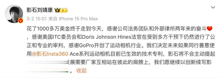 *3月2日,影石创举东谈主刘靖康发文,对337打听终裁胜诉进行恢复。