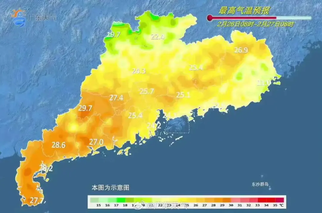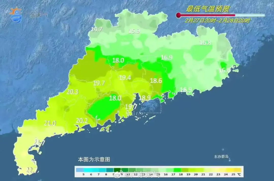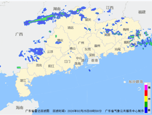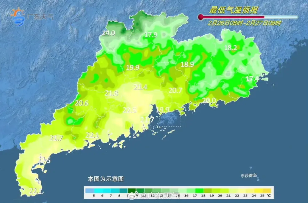2月25日白日到26日朝晨,清远、韶关出现了小雨,其余大部市县阴天间多云,局部出现了小雨,早晚时段雷州半岛、清远北部、韶关北部出现了轻雾,其中韶关乐昌和清远连山、阳山出现了雾,能见度低于1km。