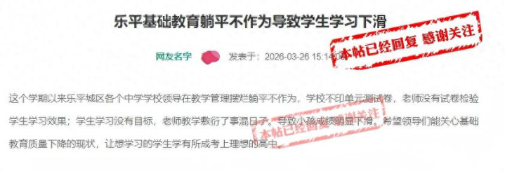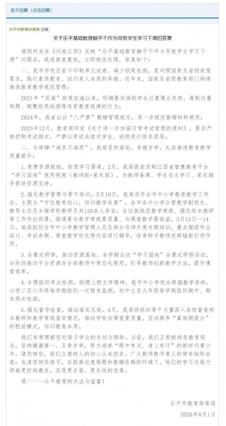近日,有江西景德镇的家长在问政平台上留言,月旦乐平下层西席“躺平”、不行动,导致学生学习下滑。