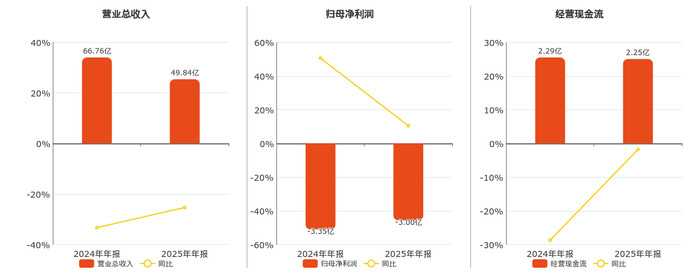 公司贸易总收入为49.84亿元,在已暴露的同行公司中排行第5,较昨年同陈述期贸易总收入减少16.92亿元,同比拟昨年同时下落25.34%。归母净利润为-3.00亿元。策动举止现款净流入为2.25亿元,较昨年同陈述期策动举止现款净流入减少406.13万元,同比拟昨年同时下落1.78%。