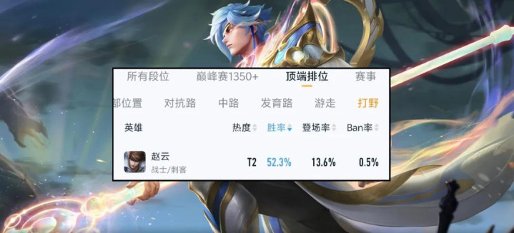 也确乎如经营之前直播时所说,赵云的此次加强是正向的,出场率、胜率皆大涨,尤其是尖端排位赛,如今胜率依然破损到了52%,挤进了强势行列。