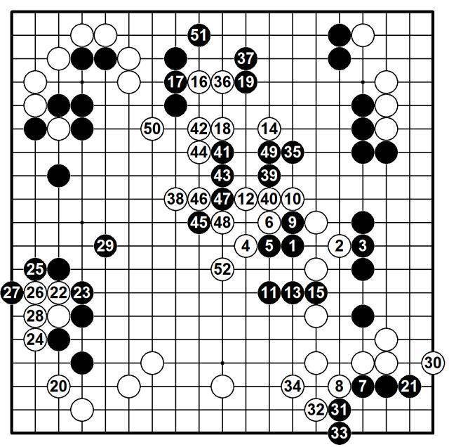 白20尖缓手,当在32为尖吃住黑角。黑35以下展露天煞星报复力,白38率先42位双与黑51相交换,实战给了黑39至黑47分断白棋报复的契机,好在白52出,大龙无忧,阵线拉长,最终白棋以4目半之优越出。★霜仁