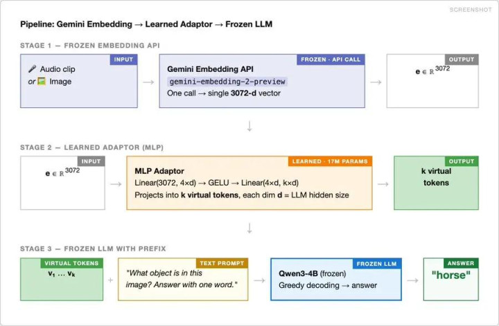Google 的 gemini-embedding-2-preview 是 Gemini API 中首个多模态镶嵌模子。它将文本、图像、视频、音频和文档映射到一个长入的 3072 维镶嵌空间——支撑跨 100 多种谈话的跨模态搜索、分类和聚类。