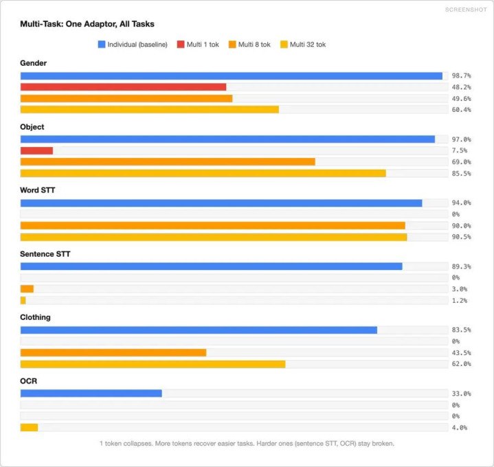 使用 32 个符号(2.61 亿个参数,米兰体育官网LLM 仍然冻结)时,物体达到 85%,服装达到 62%。但句子 STT 和 OCR 仍然无法泛泛责任。