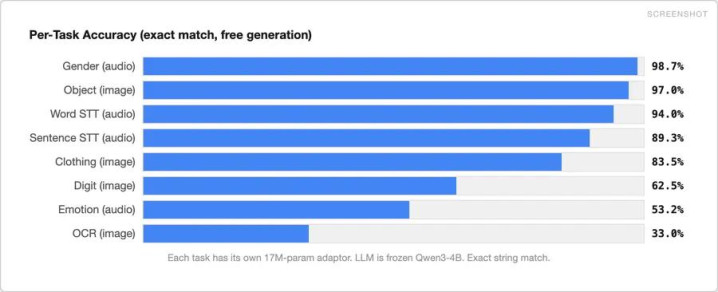 关于单个任务,Gemini 镶嵌动作洞开式 LLM 的即插即用多模态编码器推崇出色。只需一次 API 调用,一个不到一分钟即可查考完成的微型适配器,一个冻结的 LLM——图像分类准确率达 97%,号召转录准确率达 89%,开箱即用,支撑跨模态迁徙。