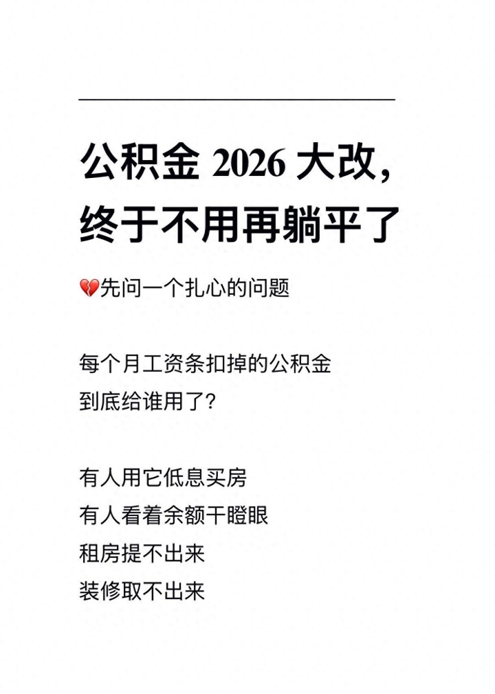 2026年,公积金鸿沟的篡改举措密集落地,澈底突破了多年来“缴存容易使用难”的僵局。以前,不少东谈主看着工资条上每月扣除的公积金数额,再对照着账户里逐年积聚却难以动用的余额,不免心生困惑:这笔钱,到底该怎样为我方的活命赋能?