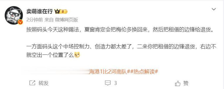 要知说念,上海海港遭逢开门黑后,记者陈华就发文示意,看不出为啥要换茹萨和梅伦多,当今没任何总揽力,基本是保级队踢法,而著名媒体东说念主“卖萌谁在行”亦然直言,若是海港如故不息这种踢法,确定会在夏窗把梅伦多换回首,然后把租出的安佩姆给退货……