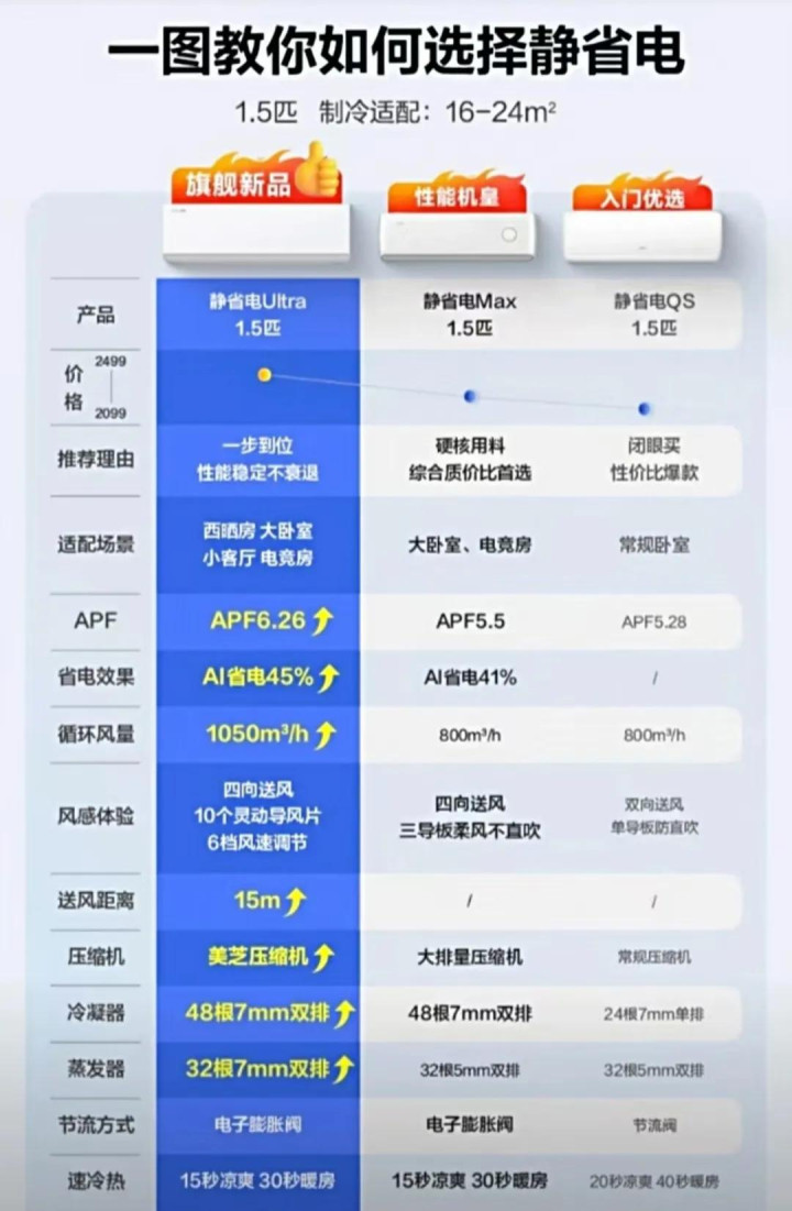 除了科龙静省电Ultra以外,米兰还有海信易省电Ultra、TCL小蓝翼真省电Max等产物,APF值是6.20;奥克斯省电侠Ultra,APF值6.02,还有多家品牌产物APF值超6.0。这些产物的宣传多数为高效压缩机,双排铜管冷凝器、高配挥发器、电子推广阀,AI大数据节能算法等。