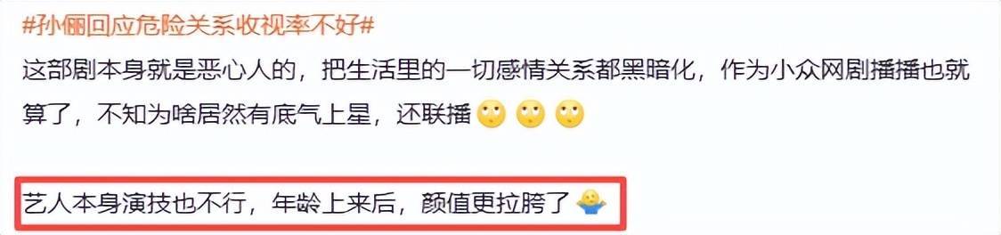 本以为这部剧中最受善良的应该是对男女之间PUA的探讨,大略是被孙俪的演技效劳,没念念到却有不少东谈主在批驳区吐槽孙俪的颜值。