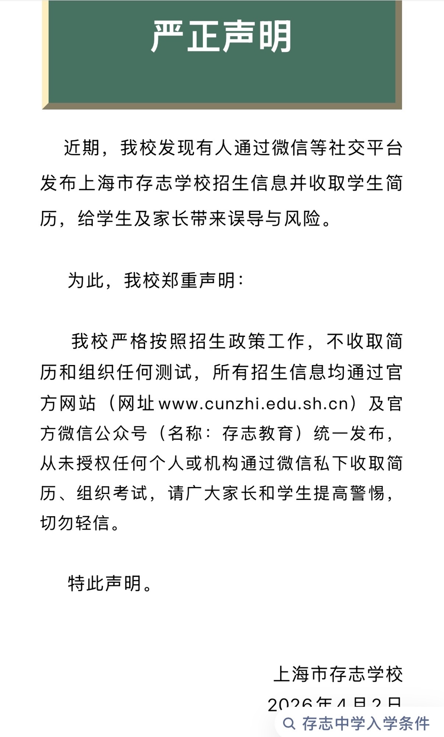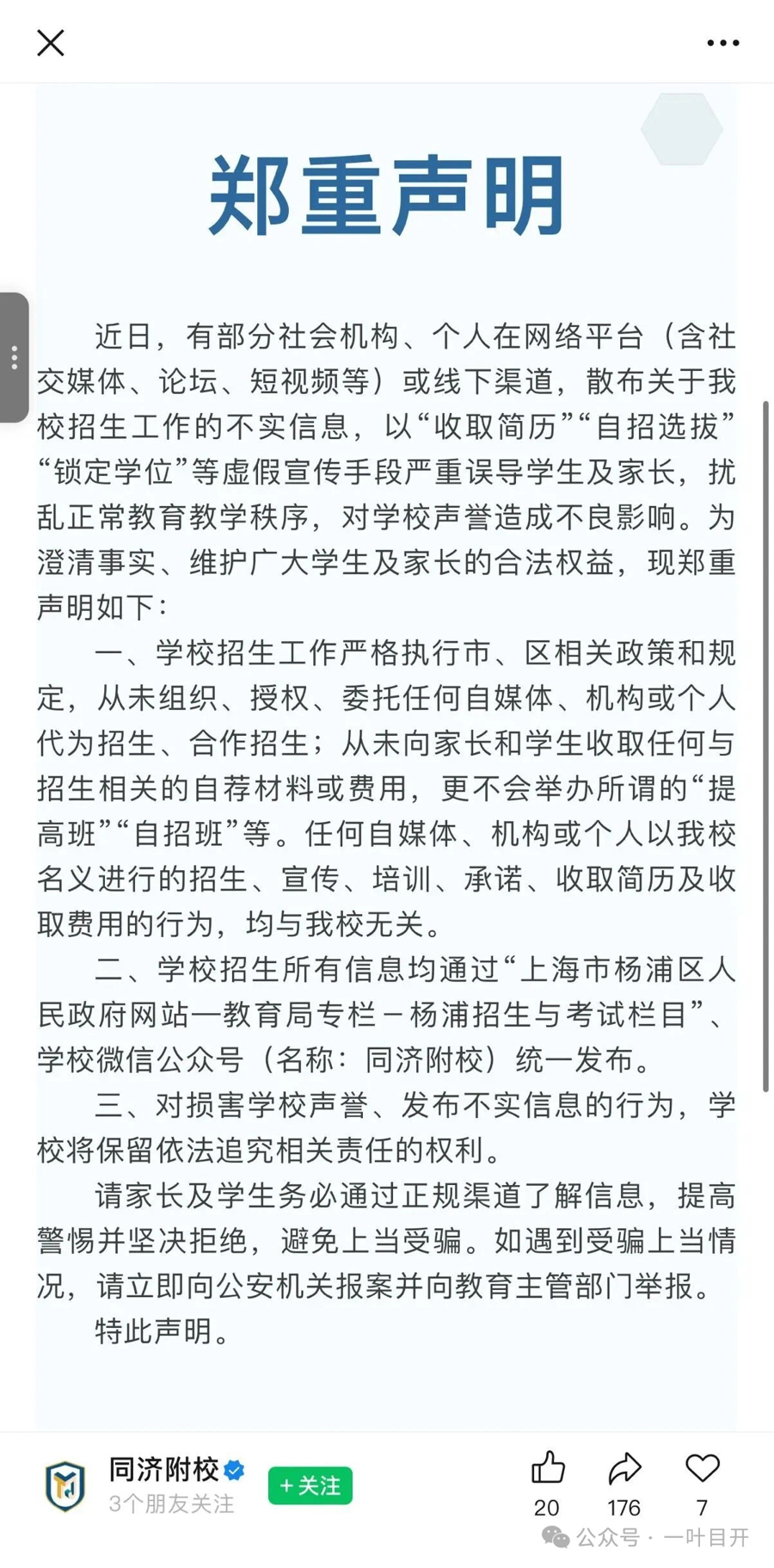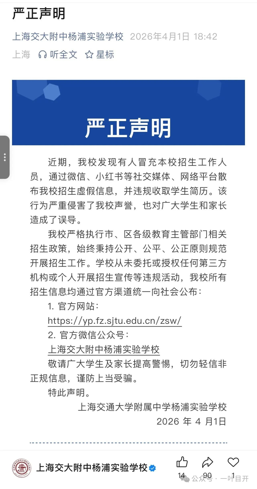 值得温煦的是,上周,上海交通大学附庸中学杨浦实验学校、上海杨浦双语学校、同济大学附庸新江湾城实验学校等纷纷发布声明,辟谣提前招生、里面选定、收取简历等作假信息,强调将严格治服阳光招生存谋。