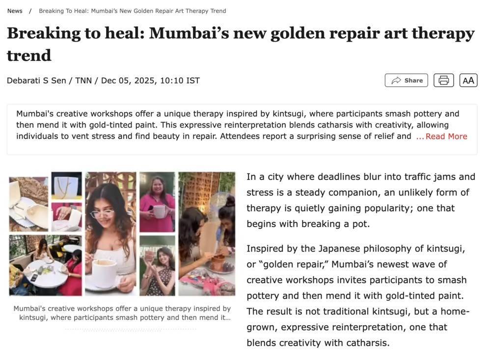 证实《印度时报》2025年12月5日的报说念,孟买当地出现了一家以金继疗愈为主题的解压店铺。东说念主们到店砸碎陶罐,然后再行金缮: